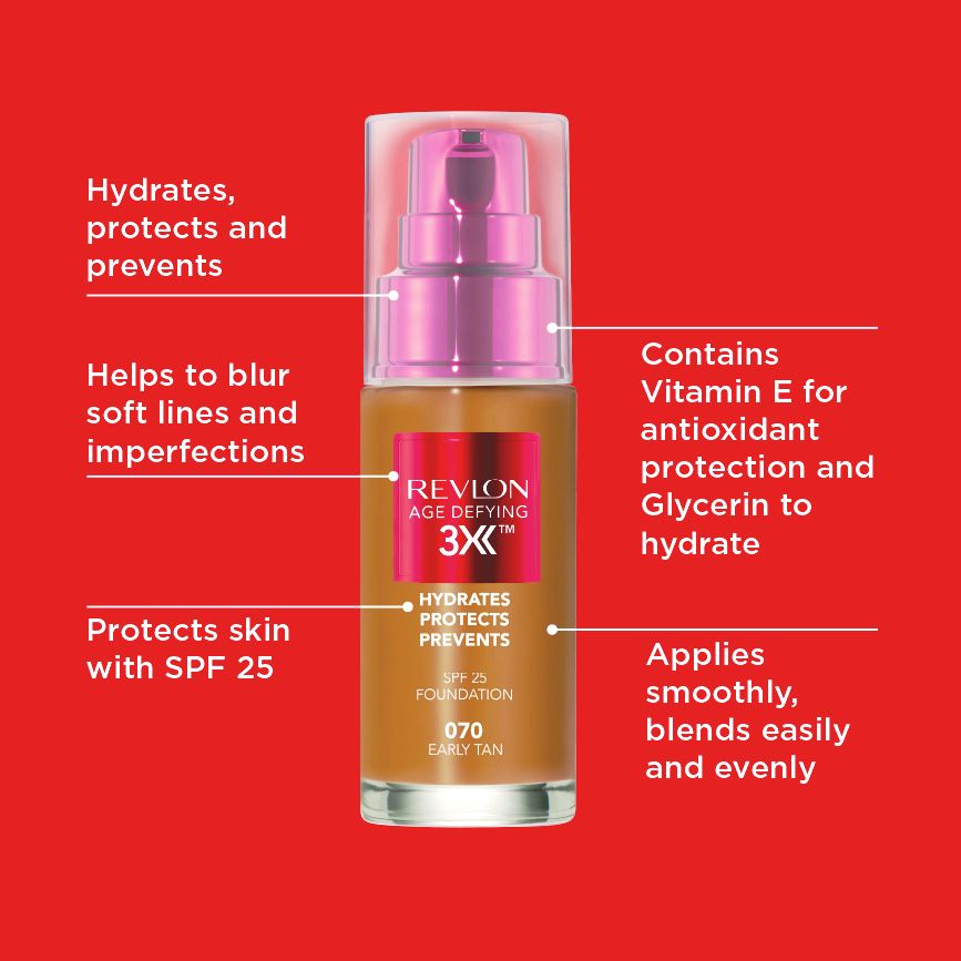 The Revlon Age Defying 3X™ Foundation is available in 9 flattering shades, carefully developed to complement a wide range of skin tones with a natural, radiant finish.